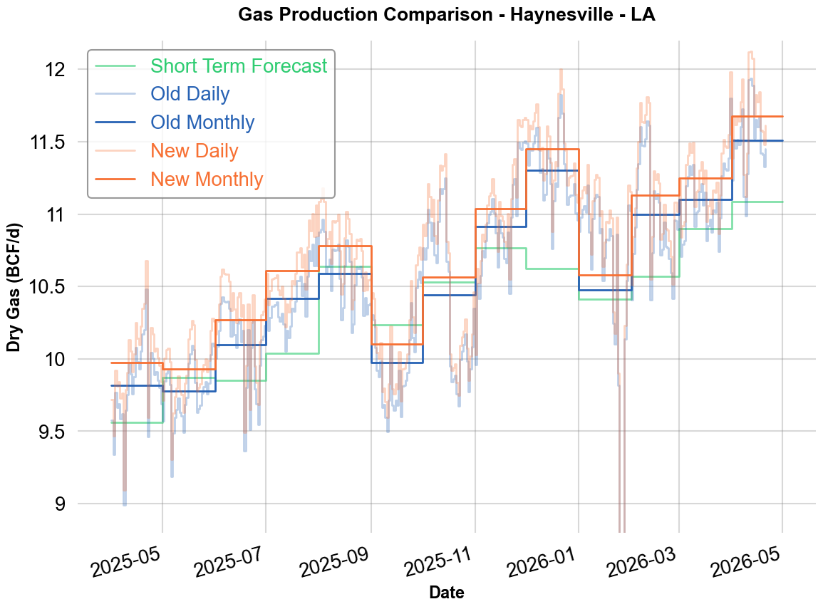 Haynesville LA has been revised upward by an average of 0.15 Bcf/d, driven entirely by state-published revisions to historical production data — with upward revisions of as much as 0.3 Bcf/d going back to January 2024.