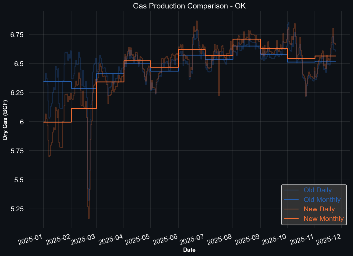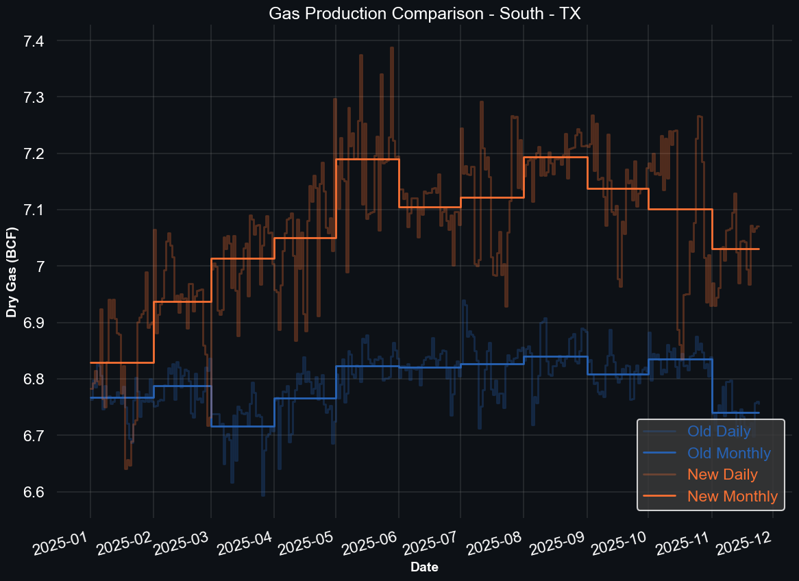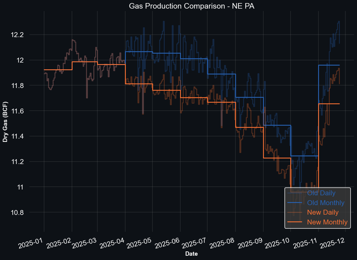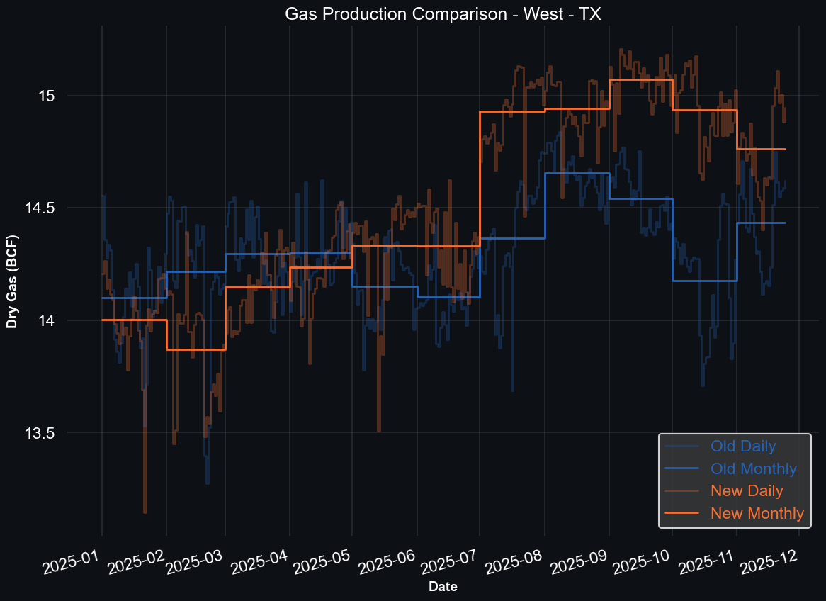 Last week, we announced a significant enhancement to our natural gas production forecasting methodology—a new three-facet hybrid approach that delivers more accurate daily production estimates across major producing regions. As we mentioned, due to the nature of the changes, it was essentially impossible to get a perfect before/after comparison, though the numbers and charts we presented were very close, we wanted to follow-up with the exact before/after. As expected, they were very close.