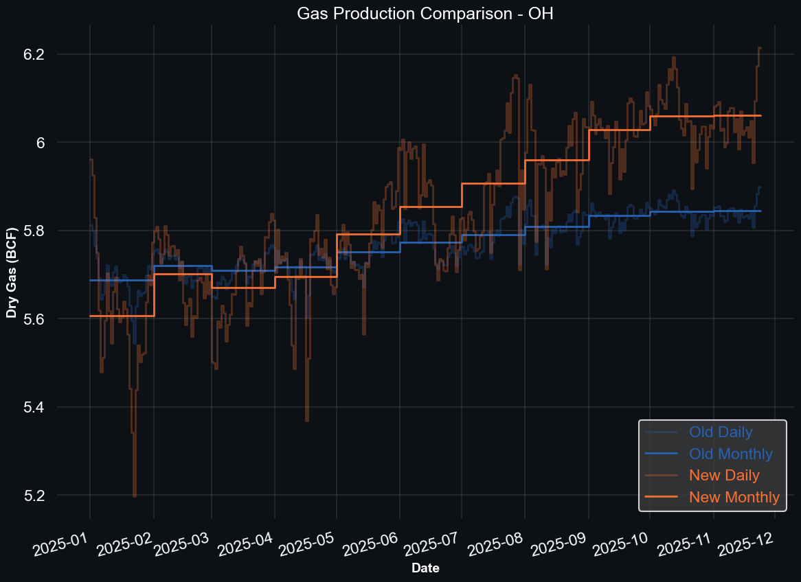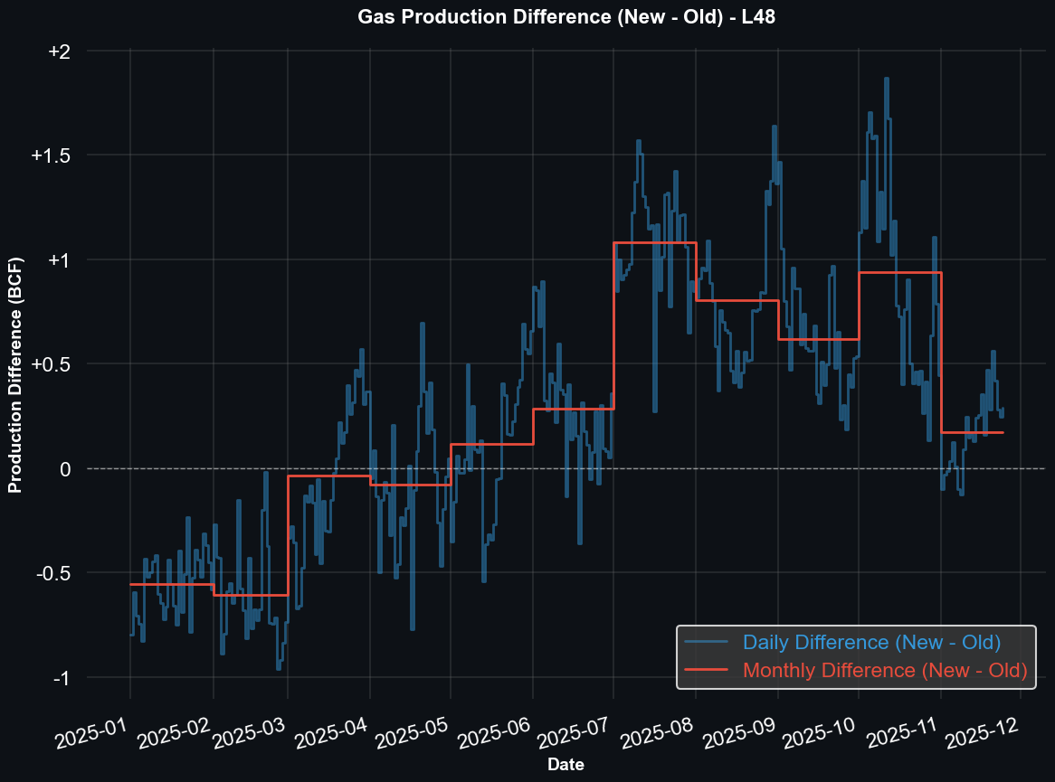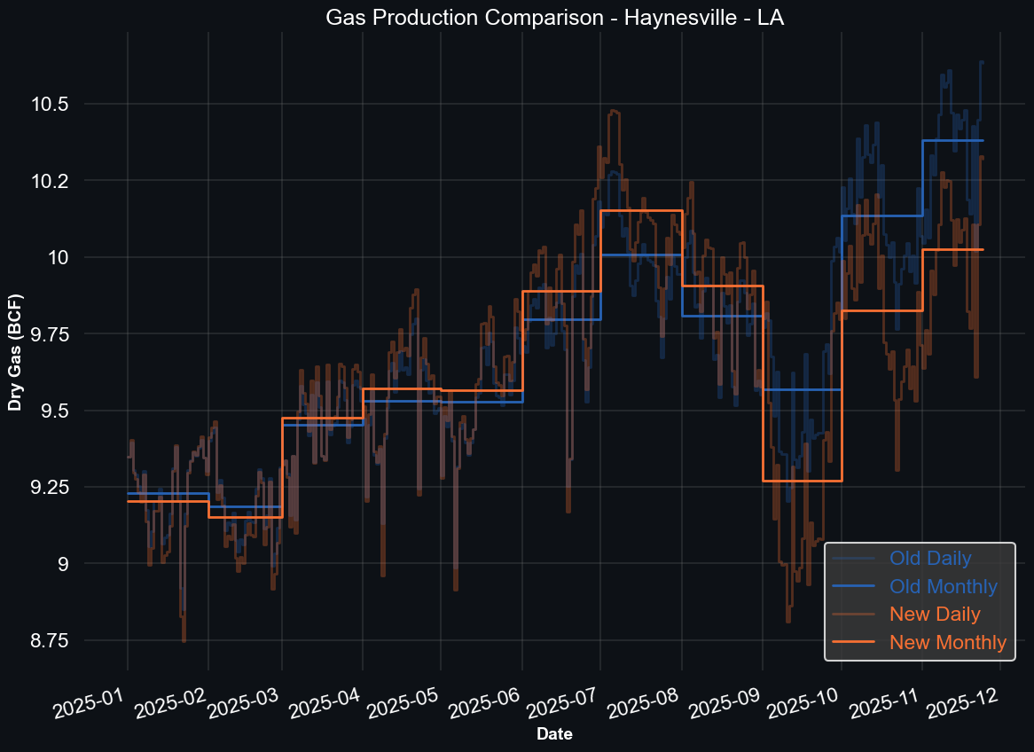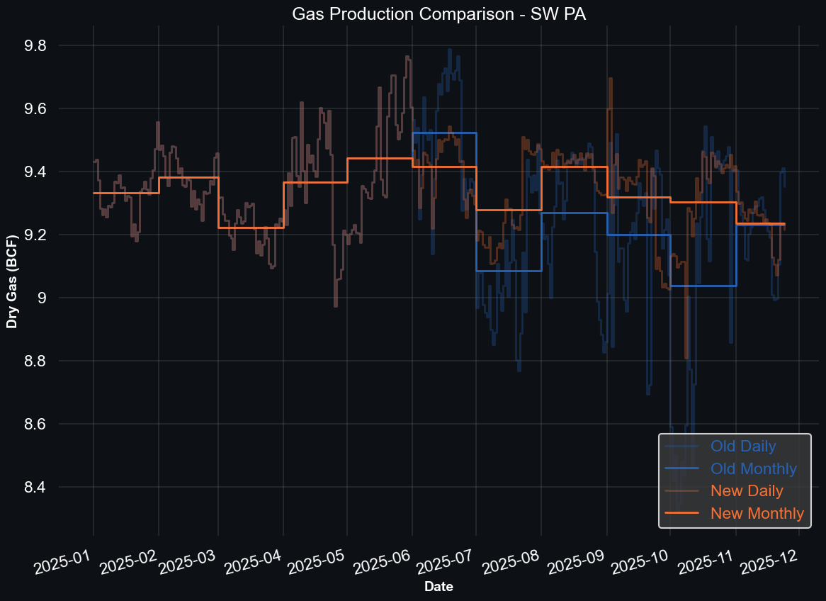 Last week, we announced a significant enhancement to our natural gas production forecasting methodology—a new three-facet hybrid approach that delivers more accurate daily production estimates across major producing regions. As we mentioned, due to the nature of the changes, it was essentially impossible to get a perfect before/after comparison, though the numbers and charts we presented were very close, we wanted to follow-up with the exact before/after. As expected, they were very close.