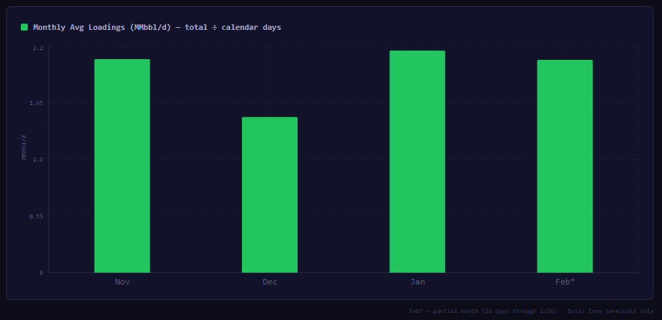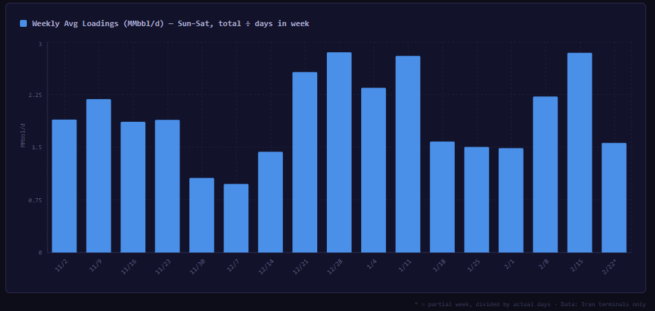 Recent reporting from the Wall Street Journal has claimed that Iran's exports surged to 3.78 mmbbl/d (WSJ) "last week" as of the publication date of 24 Feb. Bloomberg specified 15 to 20 Feb at 3.35 mmbbl/d, but called that "far beyond Tehran’s usual daily rate." Synmax's Dark Oil can confirm Bloomberg's volumes (we have 3.32 mbbl/d for that period), but short of record levels, and well-within levels recently seen.