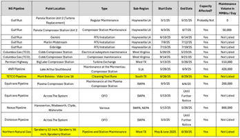 | Columbia Gas (TCO) | Cobb Compressor Station | Electrical subsystem maintenance | West Virginia | One week in May 2025 | One week in May 2025 | Yes | Not Listed |