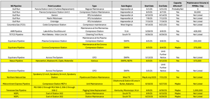 | Gulf Run | Other | Regular Maintenance | Haynesville LA | 5/1/25 | 5/31/25 | Maybe | Not Listed |