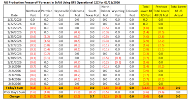 Colder weather forecasts for today’s 6Z GFS Operational compared to the 12Z GFS Operational yesterday have increased the total amount of natural gas production freeze-offs in the Lower 48 from 9.6 Bcf to 16.2 Bcf.