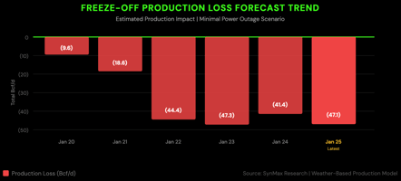 Based on today’s (1/27) GFS Operational 12Z, total natural gas freeze-offs during the 01/22 through 02/11 time period are expected to be between 45.9 Bcf to 116.8 Bcf, little changed from yesterday’s (1/26) 46.2 Bcf to 111.5 Bcf range. Haynesville LA & Haynesville TX outages are now significant and are factored in for both the high and low end of the range from 01/25/2026 out to 01/28/2026. Based on the latest power outage data for the parishes and counties in Haynesville LA & Haynesville TX, an additional 1.96 Bcf/d of production is assumed to be lost from 01/25/2026 to 01/28/2026.