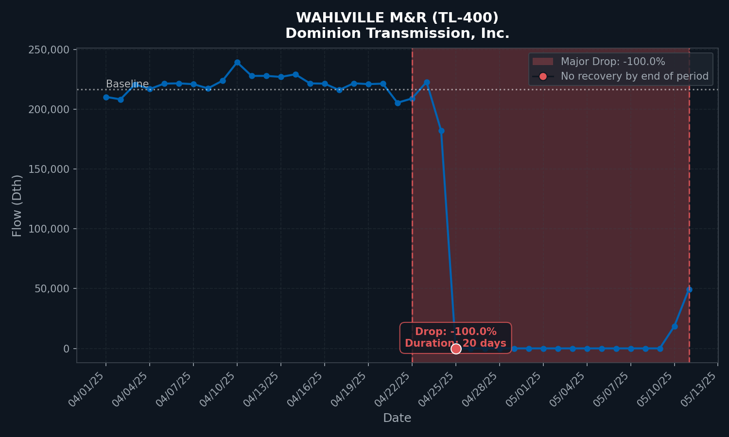 Likewise, the Wahlville metering station also in Butler PA shows the same pattern, with flows declining to zero on 4/25/25 and appearing to begin their return to service in the most recent pipeline nominations.