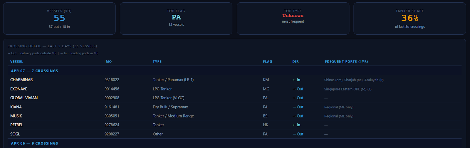 - Flow Dynamics: Traffic is currently dominated by outbound departures (163 crossings) versus inbound arrivals (59 vessels), reflecting a mass exodus from the Persian Gulf. Only 18 vessels have completed a full round-trip.