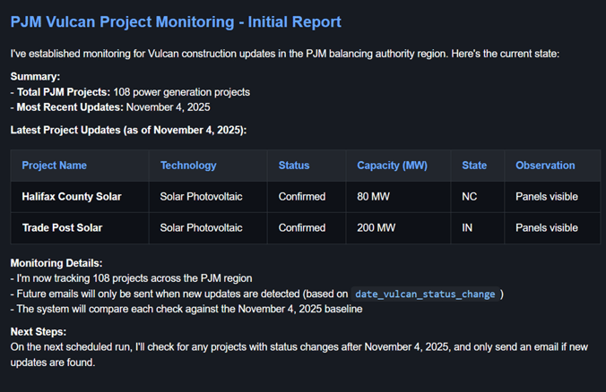 The Agent was wise on its own to conduct the analysis using the distinct periods of 2016–2018 vs. 2022–2024. When I asked it why it chose these dates, it cited the impact of COVID and the need to create a symmetrical analysis. Not bad! I think I will forgive this "first-year worker" for its previous mistake regarding future dates and not initially realizing projects are getting larger, given this insightful thought. Once again, policy and policymakers do have an impact. The anti-fossil fuel stance, particularly the opposition to natural gas, has slowed and eliminated the building of Combined Cycle power plants in the U.S. These plants are now very much needed as data center load growth accelerates. The Agent successfully concluded the issue related to natural gas and logically justifying the improvements on other technologies but one does need to question the result as you would do with any first year analyst. Agent Functionality and Efficiency One can also schedule tasks such as: "Review the data and send me updates when a project in PJM is updated in Vulcan." Our Agents can be used to create better workflow efficiency.