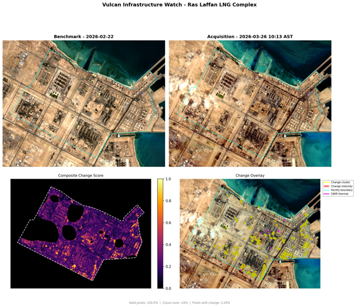 This update extends our ongoing Vulcan Infrastructure Watch (IW) assessment of critical energy and industrial infrastructure across the Persian Gulf. Since our last report (covering cycles through March 23), the conflict has continued to escalate; Iranian retaliatory strikes are now targeting heavy industry across multiple Gulf states. This update covers four additional site assessments completed between March 26 and March 30, 2026.