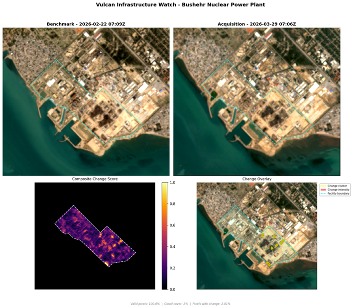 - Analysis: Imagery shows minimal change to the primary facility. Detected change clusters are concentrated along the southern waterfront rather than the reactor dome or critical plant structures. No evidence of large-scale structural damage is visible.