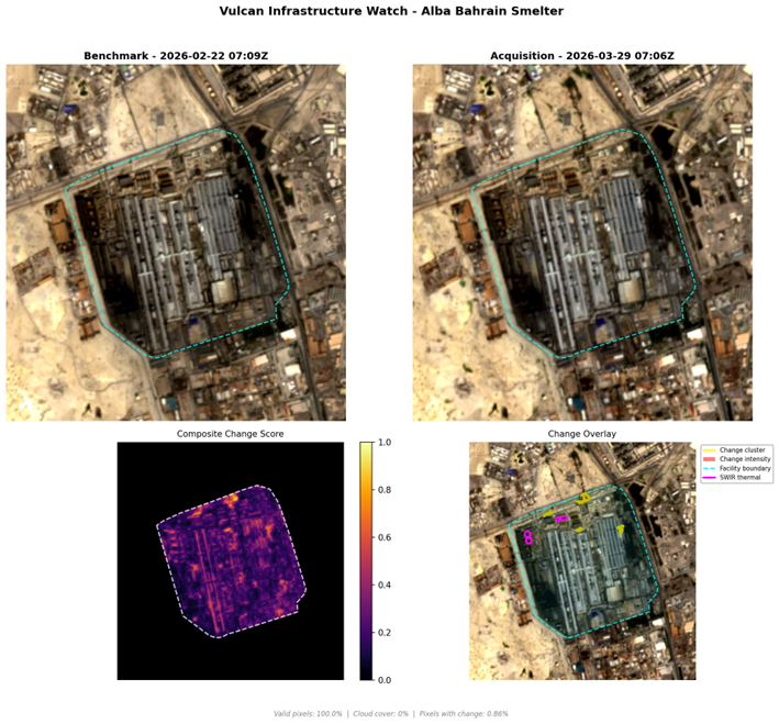 Of the 15 sites currently monitored by IW, this update covers four recent assessments: Ras Laffan LNG Complex, Bushehr Nuclear Power Plant, Alba Bahrain Smelter, and EGA Al Taweelah Smelter. Ras Laffan shows change clusters in our automated detection, though damages to individual components are not visible at 10-meter resolution. The remaining three sites were assessed following reported attacks and requests, and none show evidence of large-scale structural damage in our Sentinel-2 analysis.