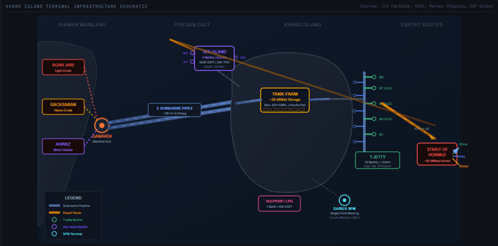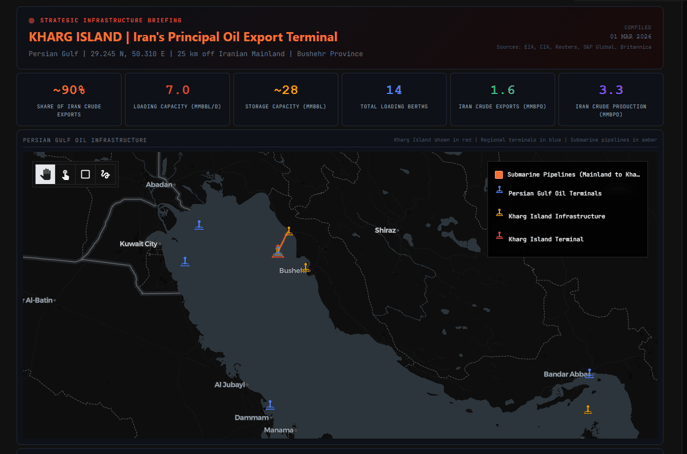 Located approximately 25 km off Iran’s Bushehr coast, Kharg Island is the most critical node in Iran’s energy architecture. As one of the world's highest-capacity terminals, its facilities have historically handled volumes exceeding 2 million barrels per day (mb/d).