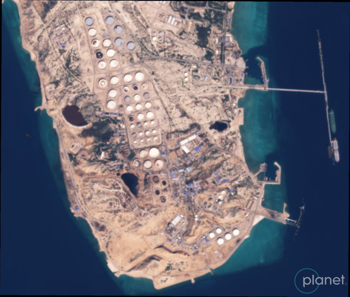 Kharg Island — February 27, 2026. Southern terminal area, clear condition. Imagery: Planet Labs PBC.