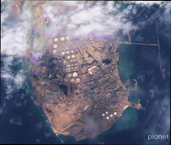Kharg Island — March 1, 2026. Southern terminal area, partial cloud cover.Imagery: Planet Labs PBC.