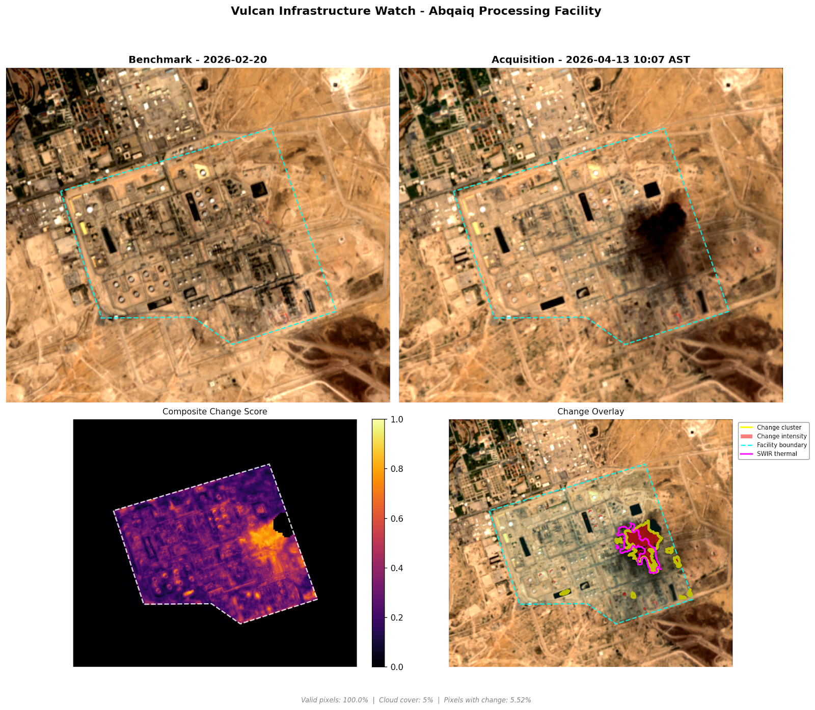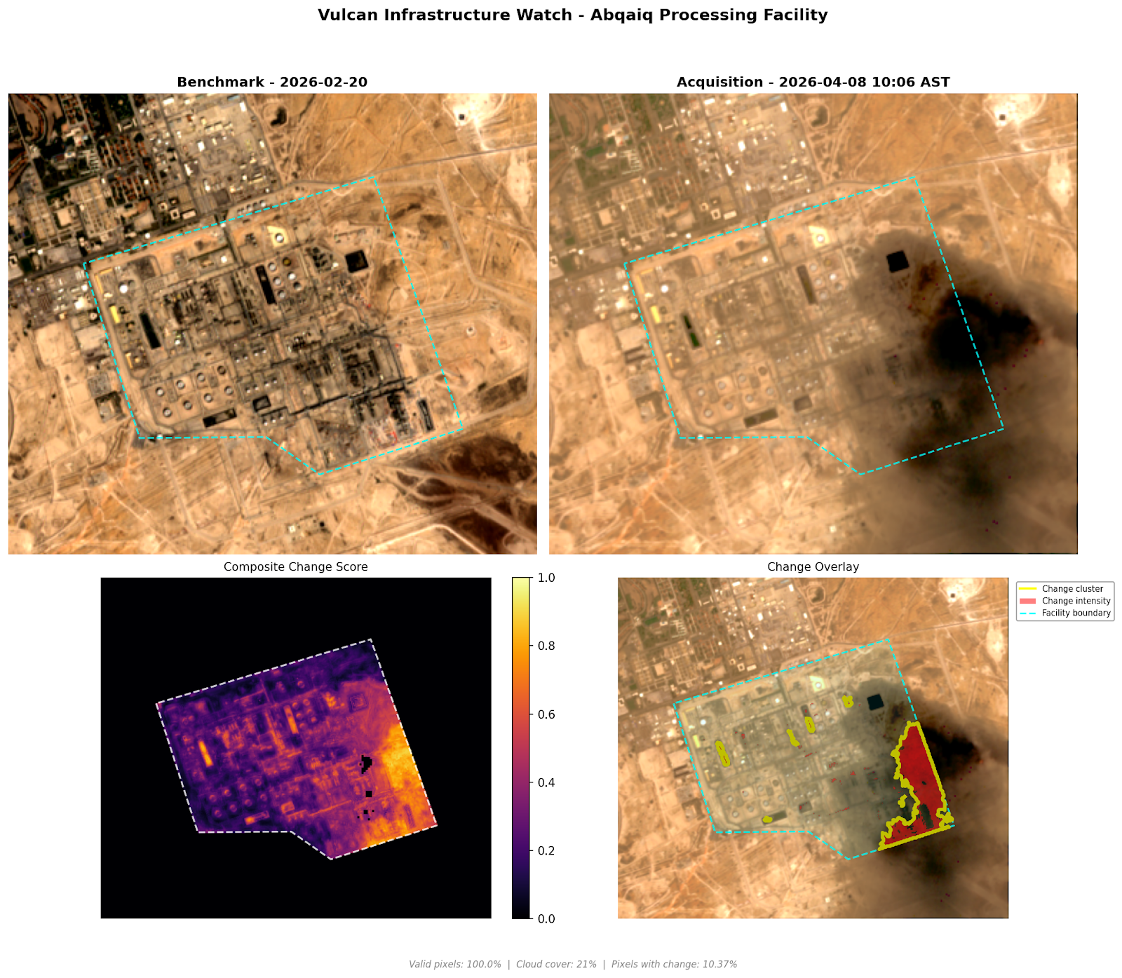 On April 8 — the same day the US-Iran ceasefire was announced — Vulcan's optical imagery detected an active fire and large smoke plume at Abqaiq, the world's largest crude stabilization plant.